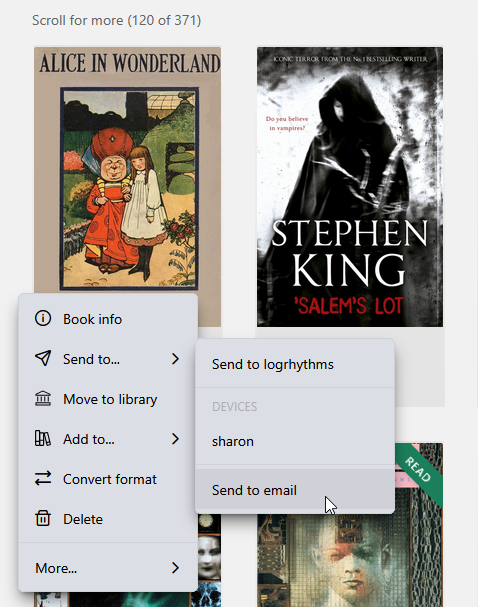 Clicking the More options (three dots) button on a book card opens a menu with several actions: